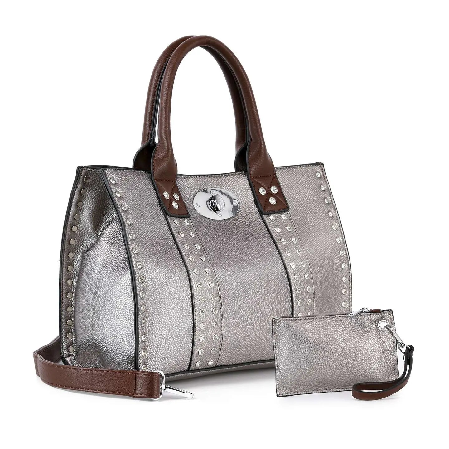 An elegant tote generously decorated with studded, sparkling stones and secured with a twist-lock clasp. This will be your new everyday bag!