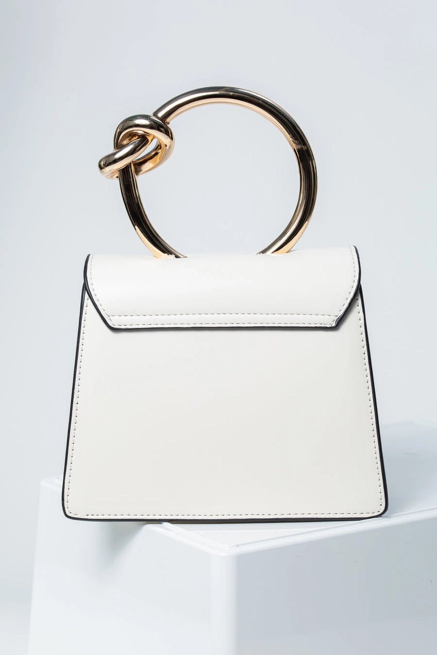 Sasha Small Metal Knot Satchel crafted in silky smooth PU leather, takes inspiration from where feminine sensuality and charm reign supreme as it brings out your inner diva. Featuring flap top with gold dollop magnetic closure, gold plated knot handle, leather and chain shoulder strap, internal slip pocket with small comb, and gold tone hardware